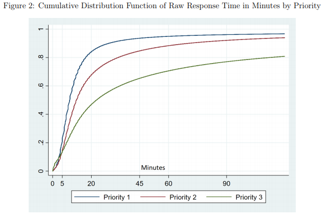 This study of 40 US law enforcement agencies and over 3 million calls for service showed that response times are far from immediate. Even for "priority 1" calls where someone's life is in immediate danger the median response time was 9 minutes while the average response time was 25 minutes!