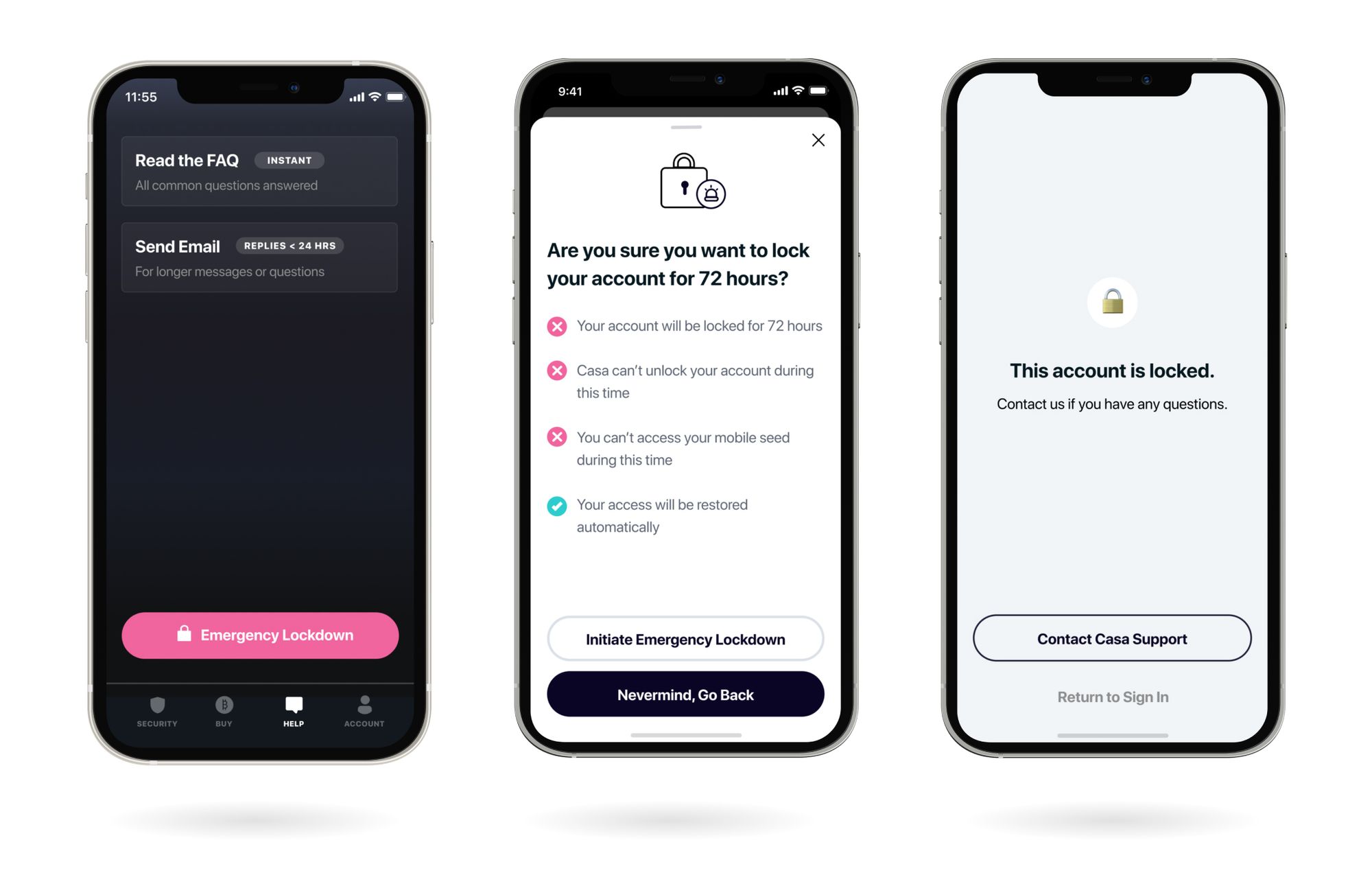 Initiating Emergency Lockdown makes it impossible for an attacker to force you to open your app, reveal your balance, or initiate a transaction. We hope that no Casa Gold member will ever need to use this feature, but we also know today’s security landscape and we expect that some clients will.