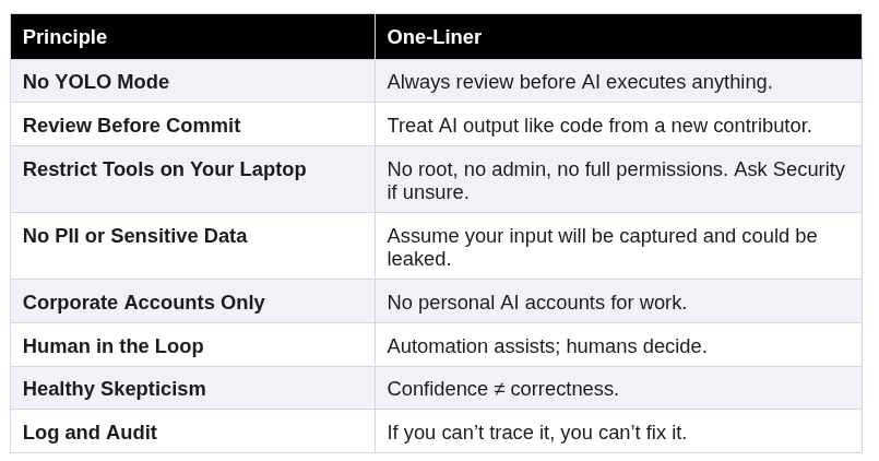 - Review what it runs. If your AI agent runs commands, read them before approving. If you don't know exactly what a command does, ask for guidance from someone who does.