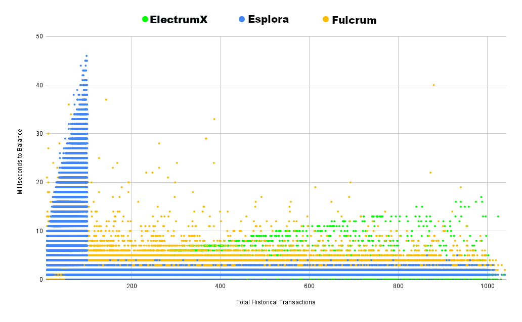 We can see that different Electrum servers have different strengths and weaknesses, likely due to how they are storing and retrieving data.