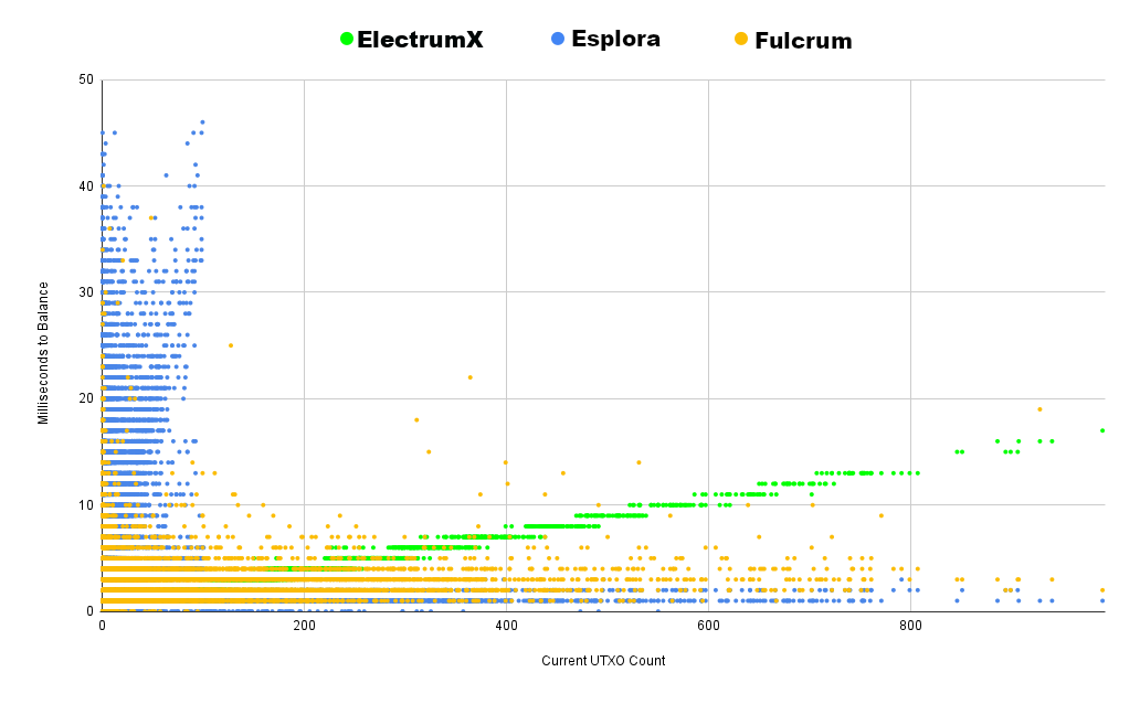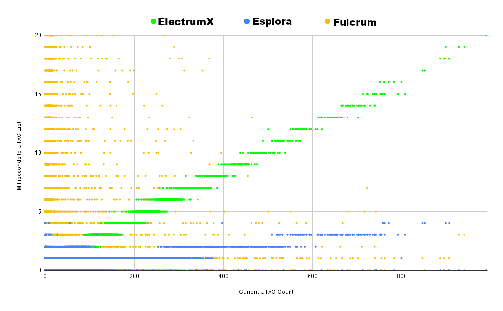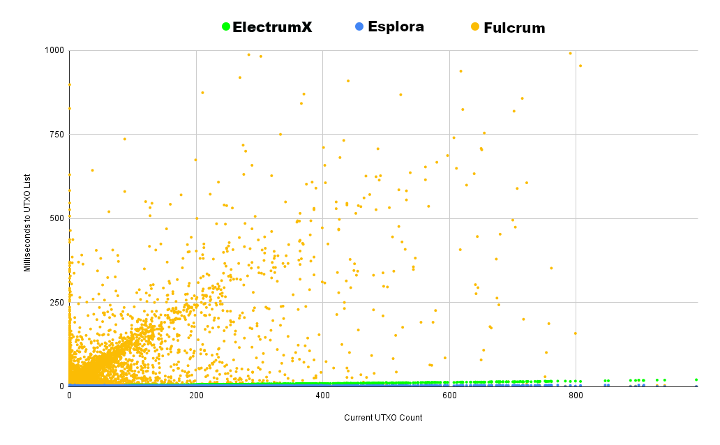 If we zoom in significantly to the previous data, we can see Esplora Electrs really shine. Near constant time scaling of UTXO lookups make it blazing fast, in some cases returning the entire result set in under a millisecond! ElectrumX returns UTXO history at a rate that scales more on the order of log(n), but its performance is no joke — 20 milliseconds for 900 UTXOs is impressive.