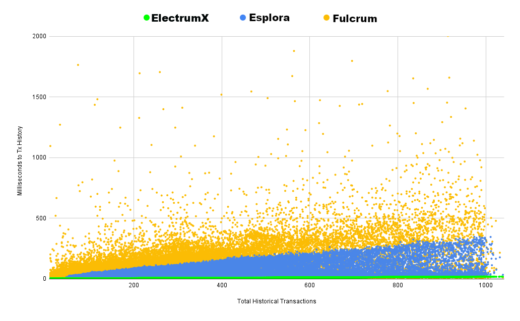 The most interesting point to note here is that ElectrumX appears to scale significantly better than both Esplora Electrs and Fulcrum when it comes to returning transaction history. ElectrumX never takes more than 20 milliseconds to return the transaction history, while Esplora Electrs can take several hundred milliseconds and Fulcrum sometimes exceeds a full second. Perhaps Esplora Electrs is not using the same constant-time caching scheme for transaction history that it's using for UTXOs and balances?