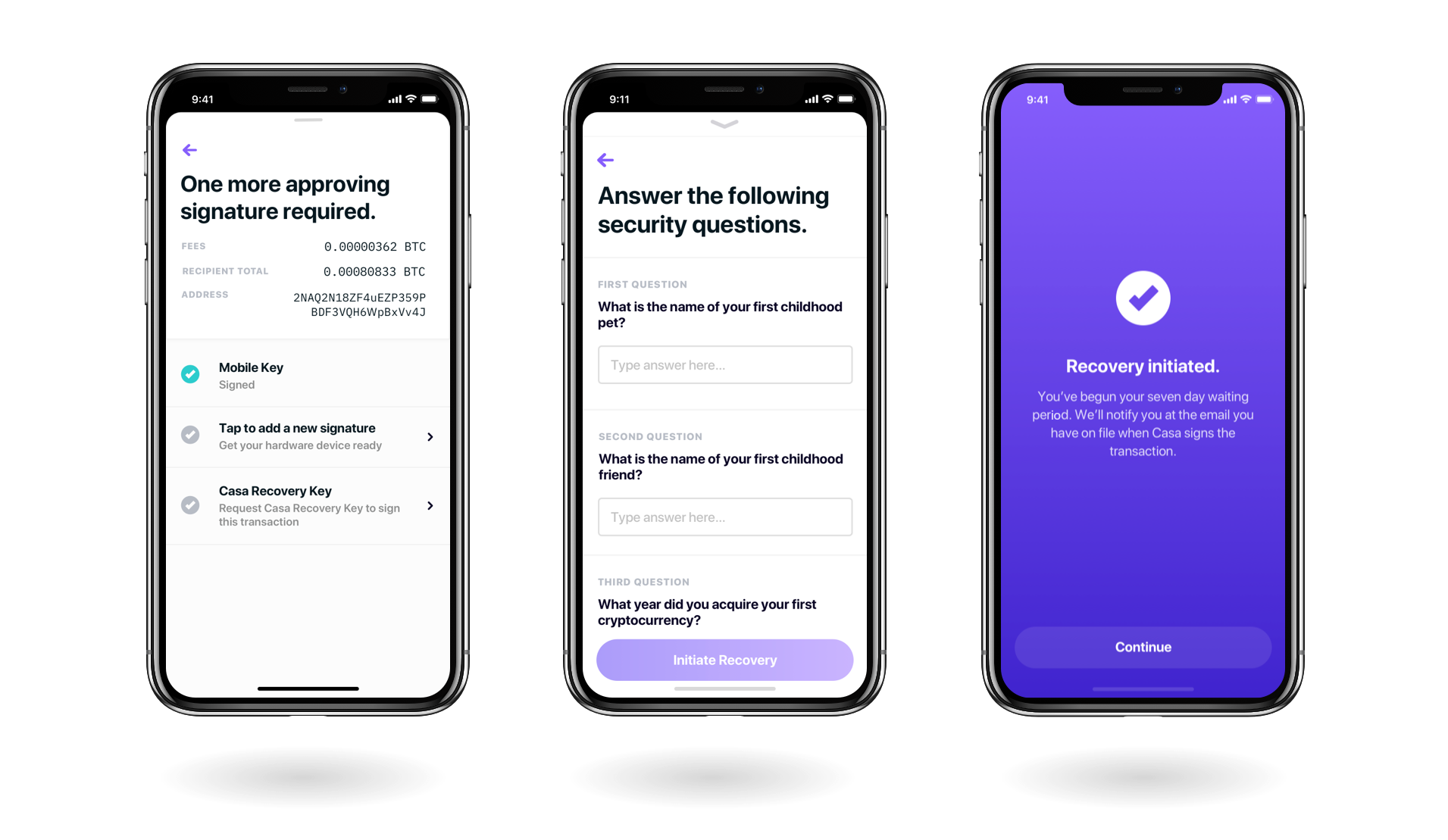 Whenever you want to request a signature from the Casa Recovery Key on your transaction, you can authorize that request by answering three security questions you created during setup. Once the questions are answered, the Casa signature is added after a 7-day security delay.