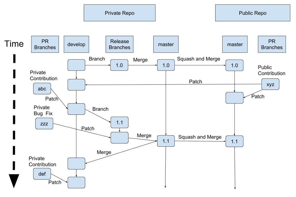 The public open source repositories will only have one long-lived branch — master. When a release is ready, we’ll squash all of the commits on the private master branch and perform a single “release” merge commit into the public master branch, then we'll tag it with the release version.