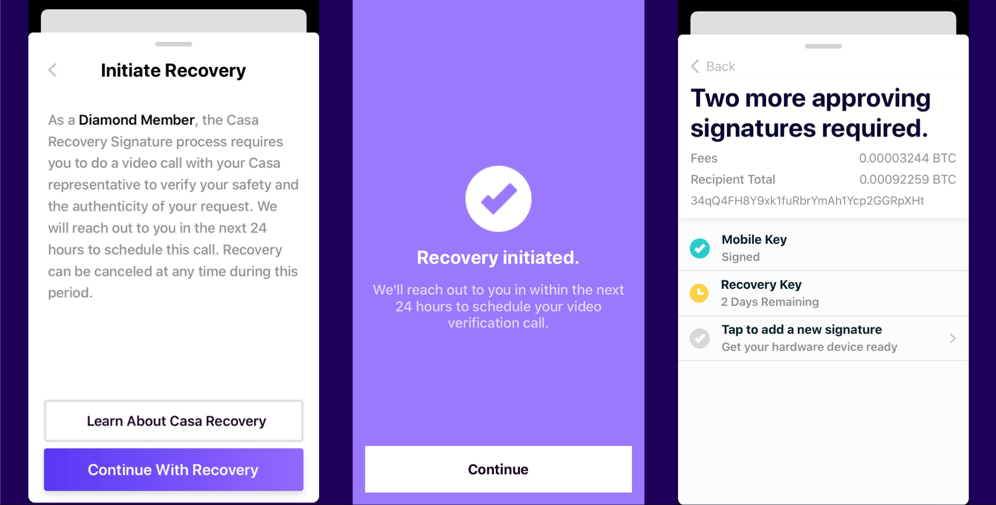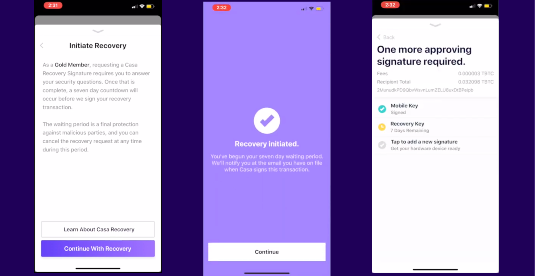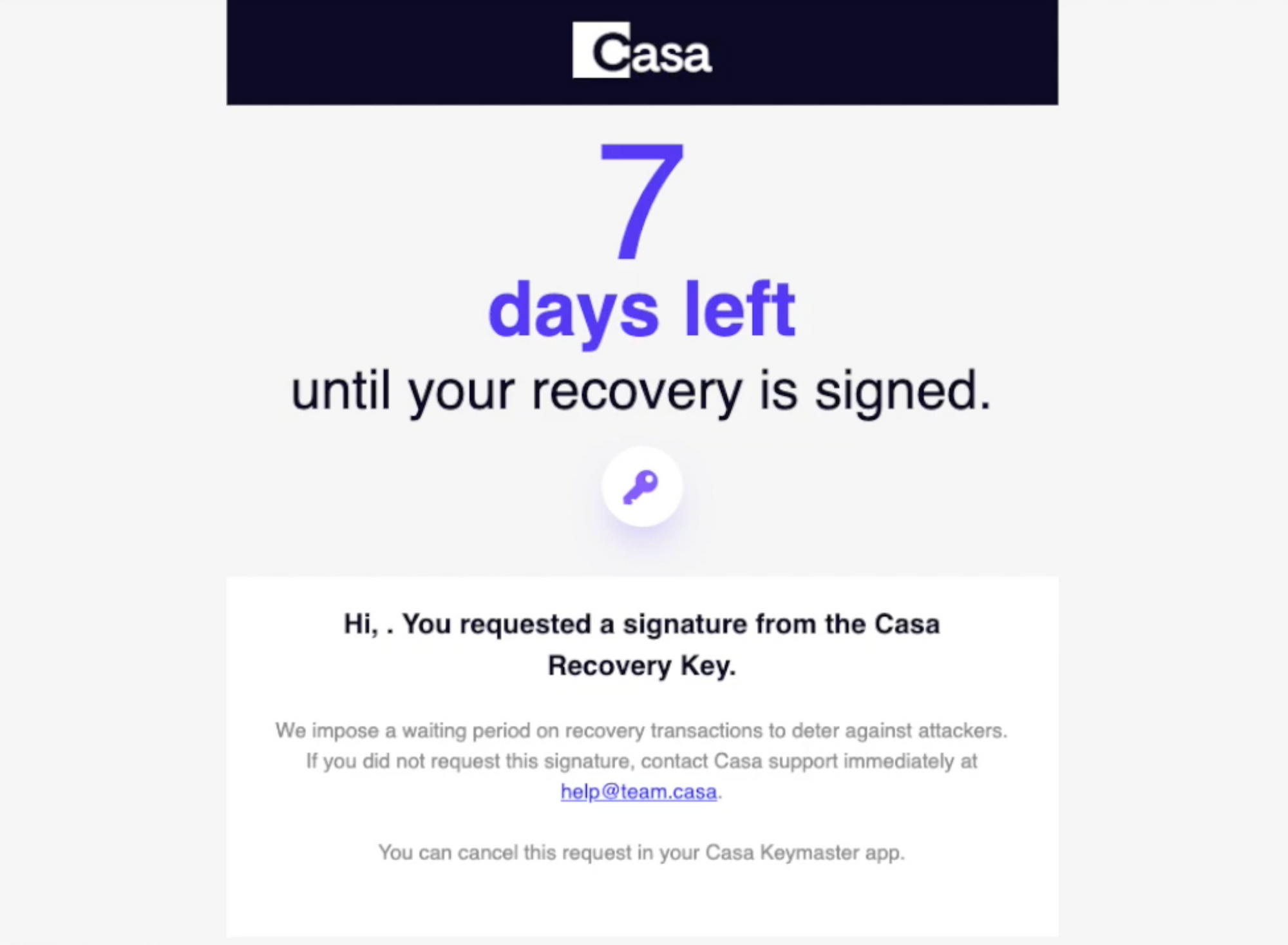 - Signature is added after a 7-day, time-delayed countdown - We’ve implemented a 7-day time delay on Gold recovery signatures after the security questions are answered. Each day during the time delay, we send users a reminder email with a countdown. In case the user’s Casa account was compromised, these emails will alert them to a false recovery attempt. In our research and experience, this has proven to be sufficient time for a user to notice and cancel a fraudulent recovery, but can never be as secure or as airtight as the video verifications performed at our premium tiers.