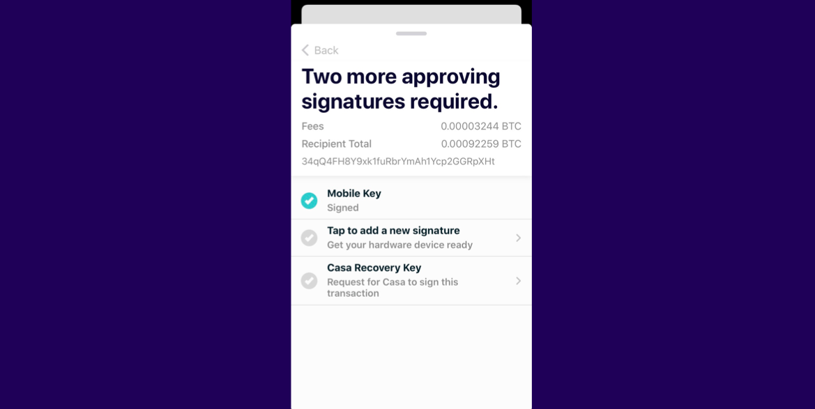 That’s why every Casa membership includes access to the Casa Recovery Key. Your Recovery Key is managed and secured by Casa and can be used to co-sign transactions at your request.