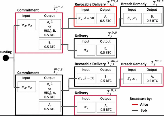 The above shows the set of pre-signed transactions that are used to construct lightning channels and update them. Lightning employs Hashed Timelock Contracts (HTLCs) to create a set of game theory that makes it difficult for one party to cheat the other.